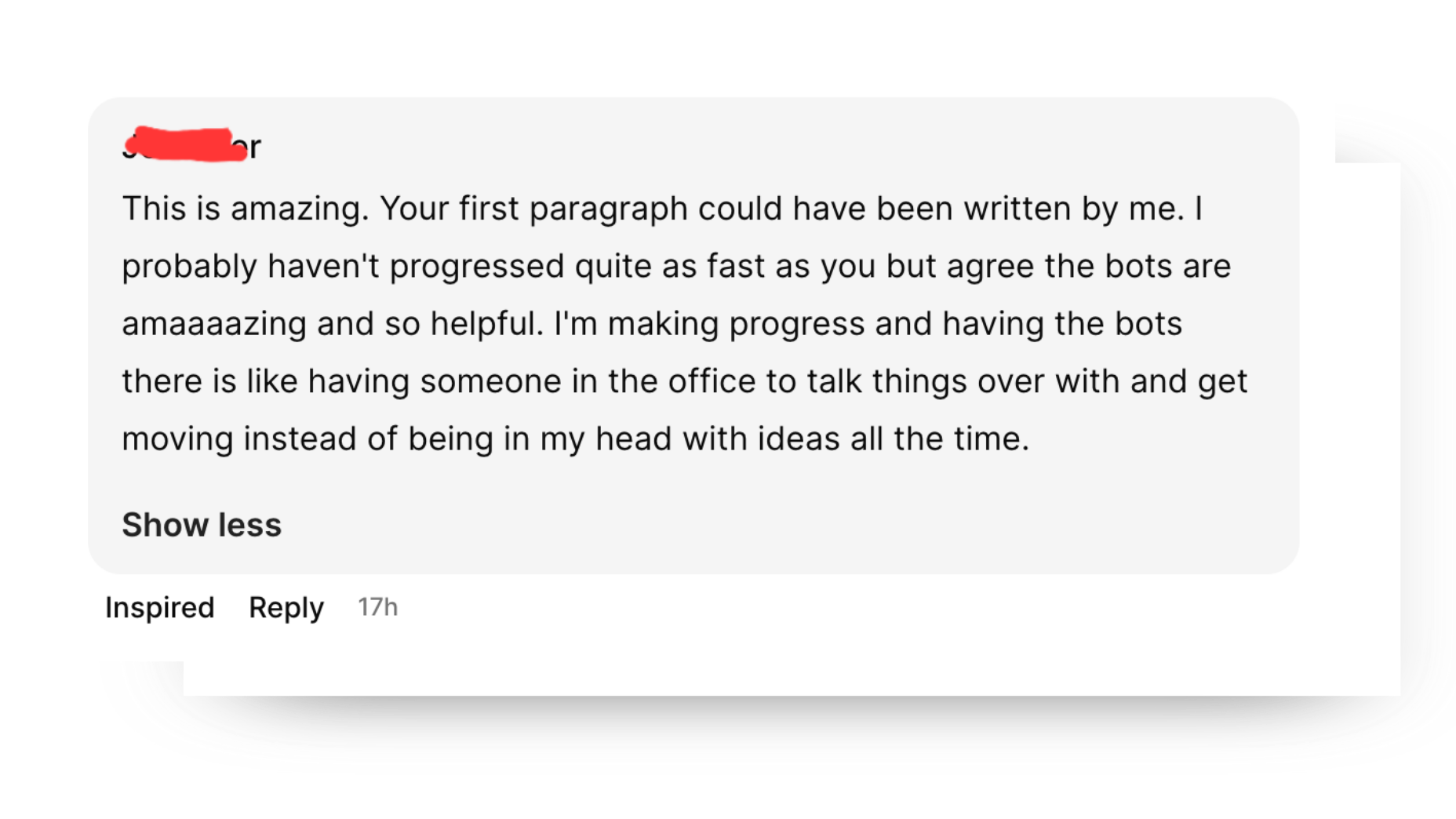 An intimate, switched-on community who are here to build, not scroll. Here to support you. To hold you accountable. To encourage your wild ideas.