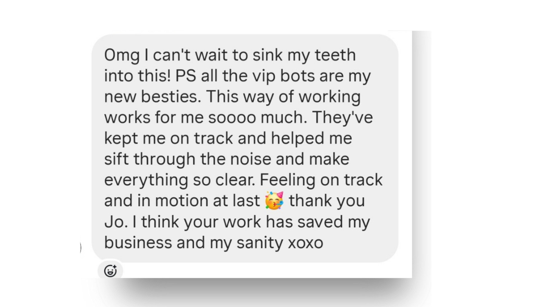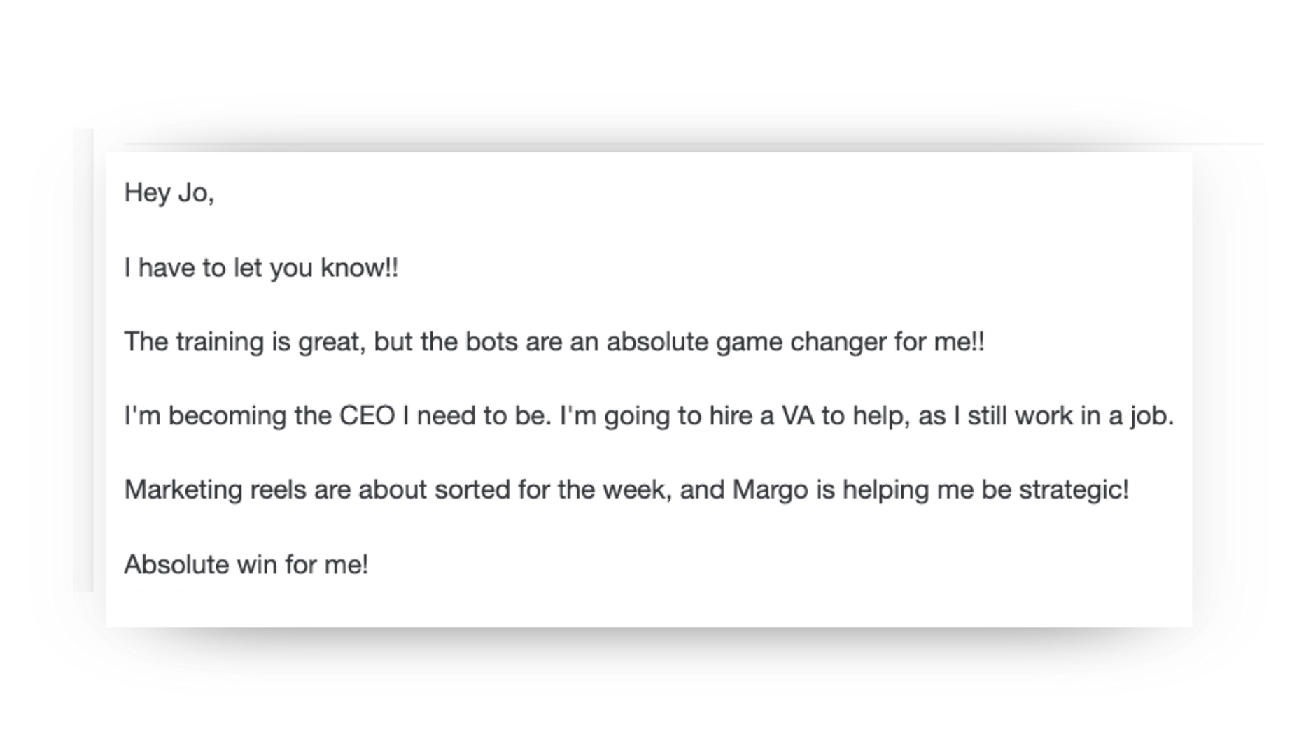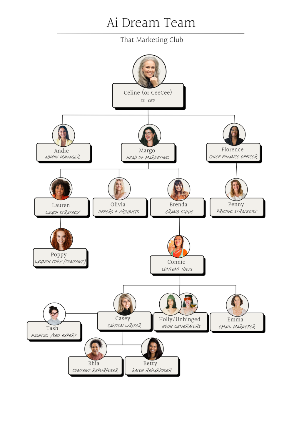 You get to install a complete team of AI bots that not only speed up the process, but support you through all your strategic decisions + do so much of the 'doing' for you. It's like having an entire team of experts and staff at your fingertips who can help you shape your offers, your pricing, guide your business decisions, plan your days, set goals, evaluate the gaps in your business, plus plan, write and repurpose all your content for you. Meet the AI Dream Team.